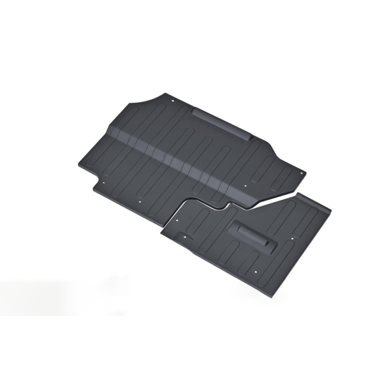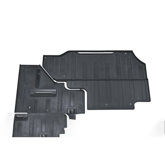 Trả lời: Tấm ốp có cấu tạo 2 mảnh rời. Thiết kế này giúp việc lắp đặt dễ dàng hơn, ôm khít vào các chi tiết phức tạp của gầm xe và quan trọng nhất là tối ưu hóa các lỗ, khe hở để tản nhiệt và thoát nước hiệu quả.